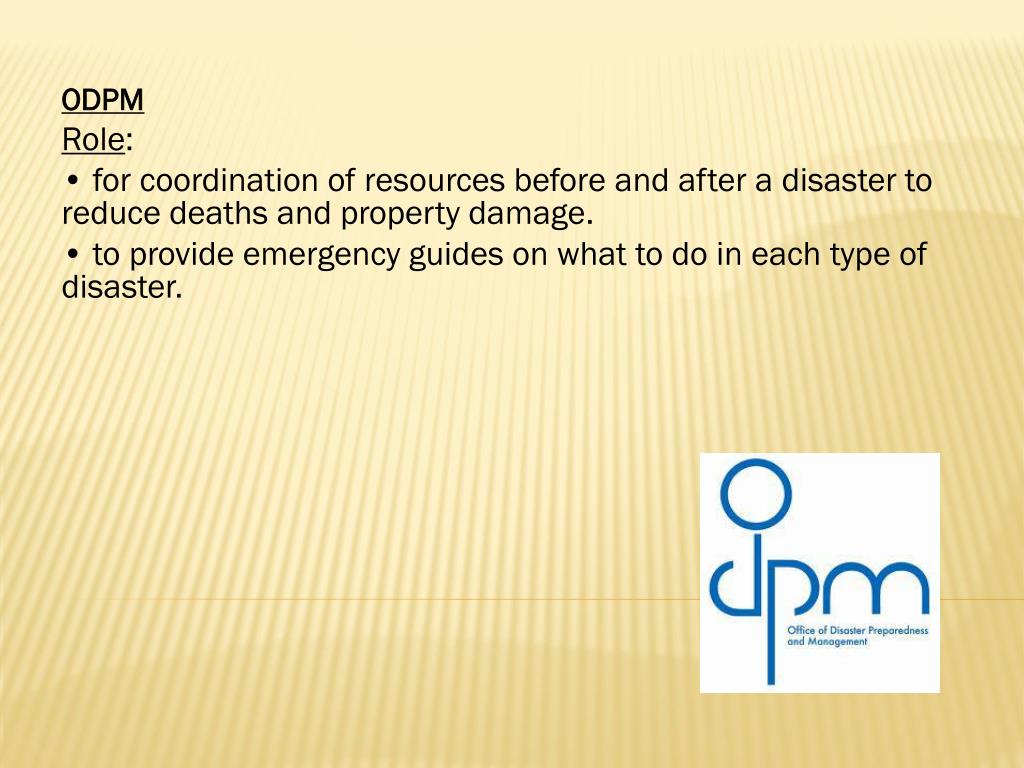 ODPM Role: • for coordination of resources before and after a disaster to reduce deaths and property damage. • to provide emergency guides on what to do in each type of disaster.
