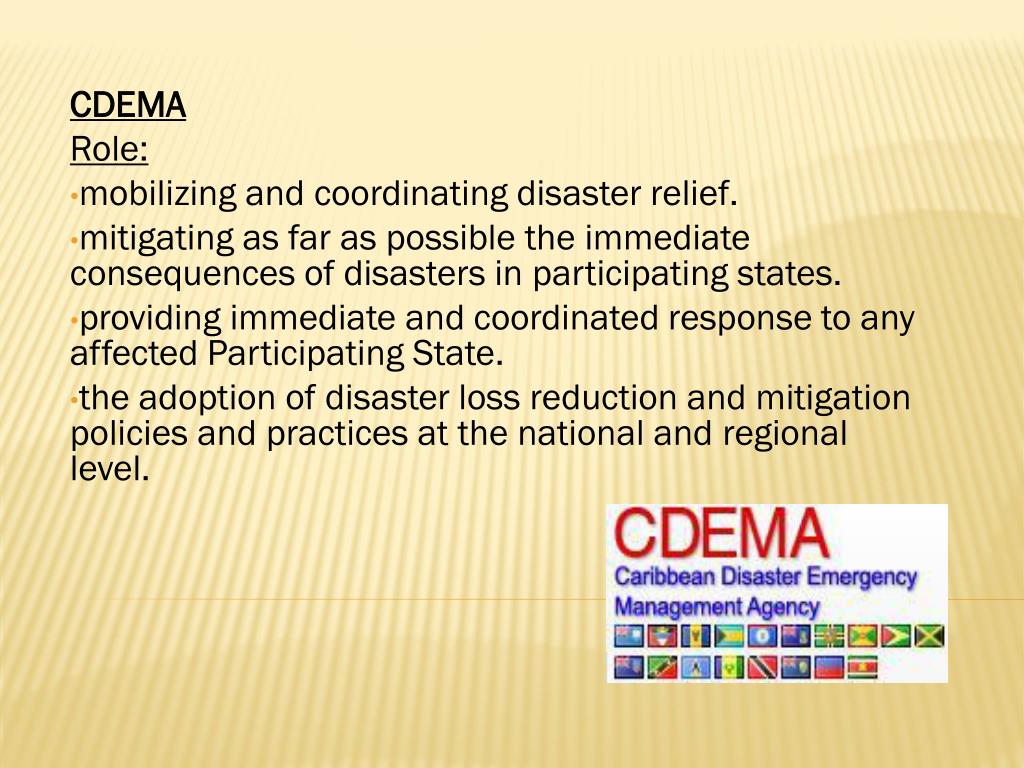CDEMA Role: mobilizing and coordinating disaster relief. mitigating as far as possible the immediate consequences of disasters in participating states. providing immediate and coordinated response to any affected Participating State. the adoption of disaster loss reduction and mitigation policies and practices at the national and regional level.
