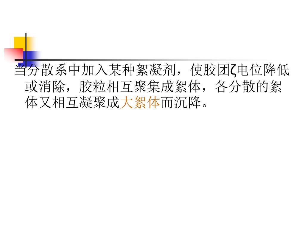 整个过程为: 电解质加入―与反离子同电荷离子―压缩双电层―电位―稳定性―凝聚