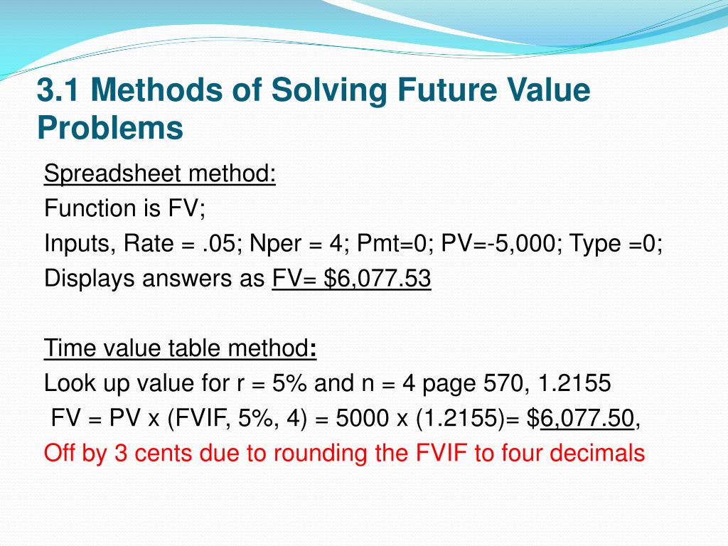 3.1 Methods of Solving Future Value Problems Spreadsheet method: Function is FV; Inputs, Rate = .05; Nper = 4; Pmt=0; PV=-5,000; Type =0; Displays answers as FV= $6,077.53 Time value table method: Look up value for r = 5% and n = 4 page 570, 1.2155 FV = PV x (FVIF, 5%, 4) = 5000 x (1.2155)= $6,077.50, Off by 3 cents due to rounding the FVIF to four decimals