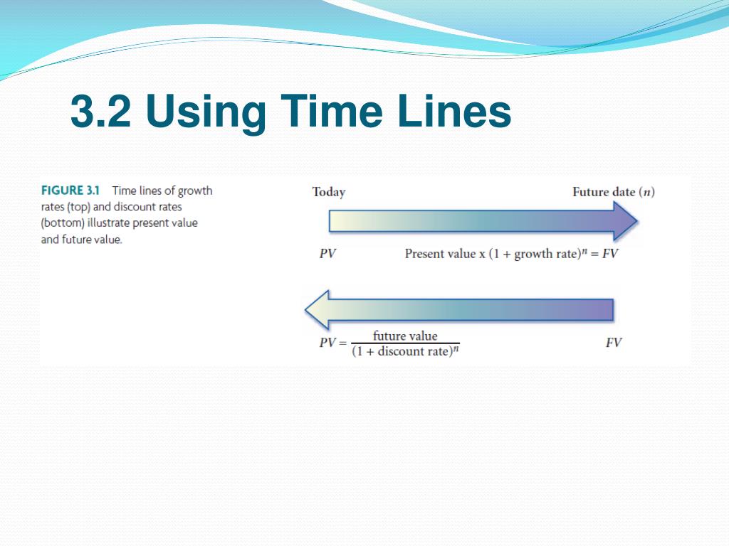 3.2 Using Time Lines • When solving time value of money problems, especially the ones involving multiple periods and complex combinations (which will be discussed later) it is always a good idea to draw a time line and label the cash flows, interest rates, and number of periods involved.