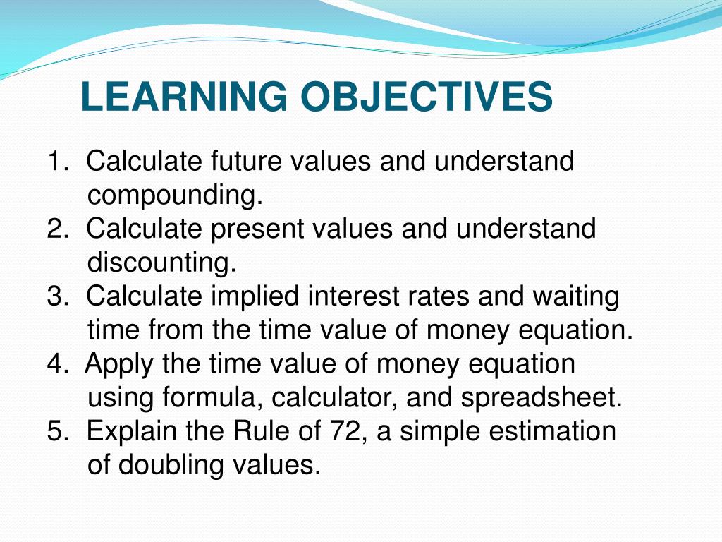LEARNING OBJECTIVES 1. Calculate future values and understand compounding. 2. Calculate present values and understand discounting. 3. Calculate implied interest rates and waiting time from the time value of money equation. 4. Apply the time value of money equation using formula, calculator, and spreadsheet. 5. Explain the Rule of 72, a simple estimation of doubling values.