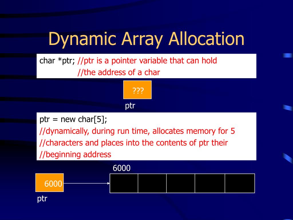 ??? ptr 6000 6000 ptr Dynamic Array Allocation char *ptr; //ptr is a pointer variable that can hold //the address of a char ptr = new char[5]; //dynamically, during run time, allocates memory for 5 //characters and places into the contents of ptr their //beginning address