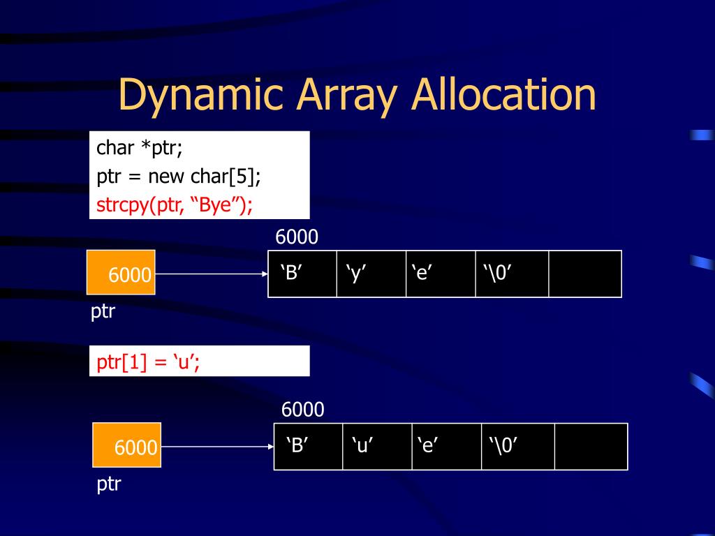 6000 6000 ‘B’ ‘B’ ‘u’ ‘y’ ‘e’ ‘e’ ‘\0’ ‘\0’ 6000 6000 ptr ptr Dynamic Array Allocation char *ptr; ptr = new char[5]; strcpy(ptr, “Bye”); ptr[1] = ‘u’;