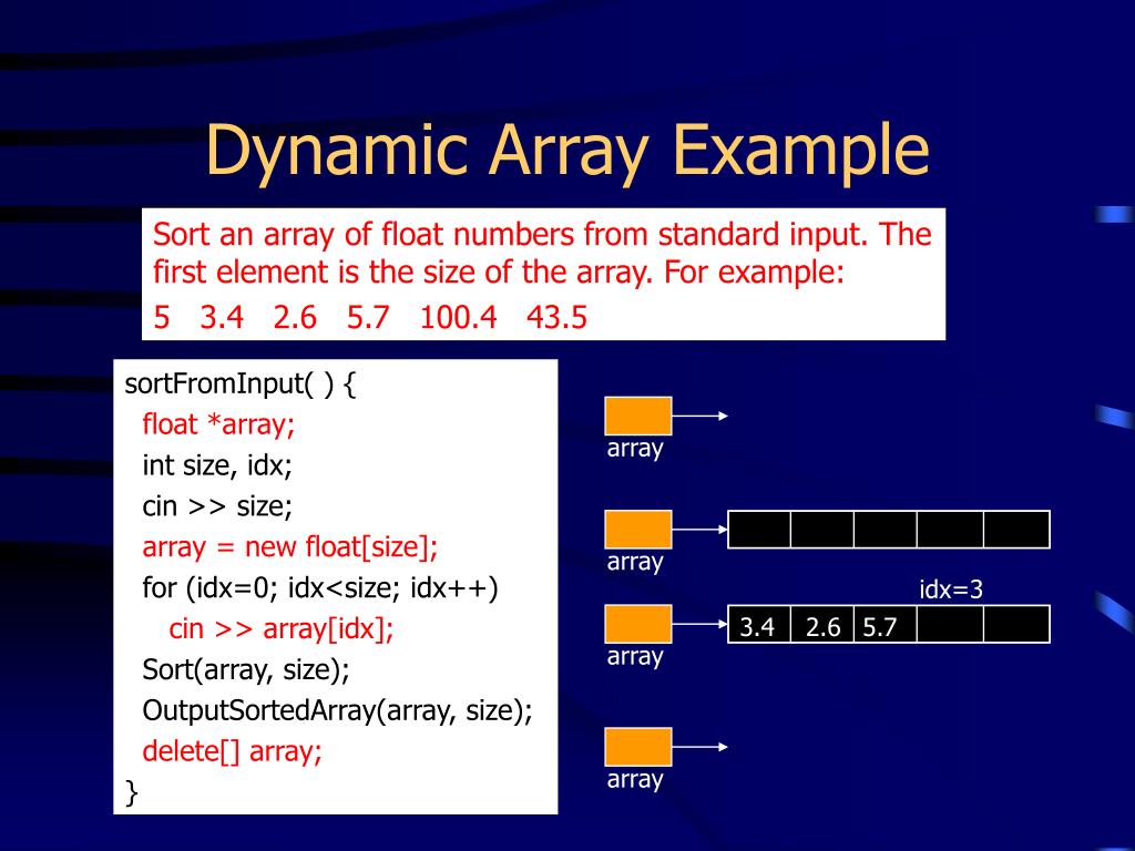 array array array array idx=3 3.4 2.6 5.7 Dynamic Array Example Sort an array of float numbers from standard input. The first element is the size of the array. For example: 5 3.4 2.6 5.7 100.4 43.5 sortFromInput( ) { float *array; int size, idx; cin >> size; array = new float[size]; for (idx=0; idx<size; idx++) cin >> array[idx]; Sort(array, size); OutputSortedArray(array, size); delete[] array; }