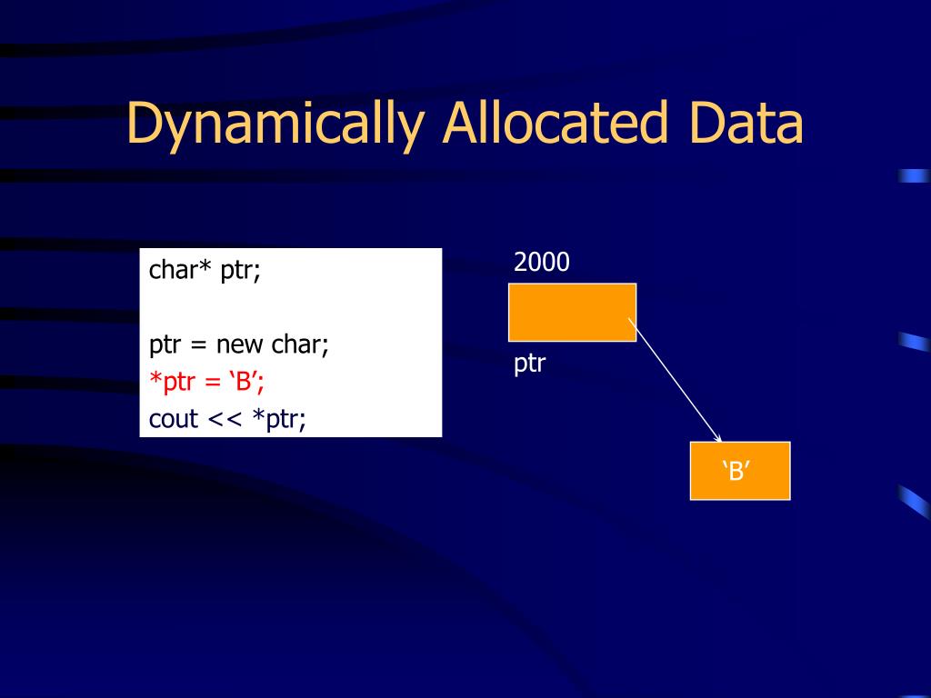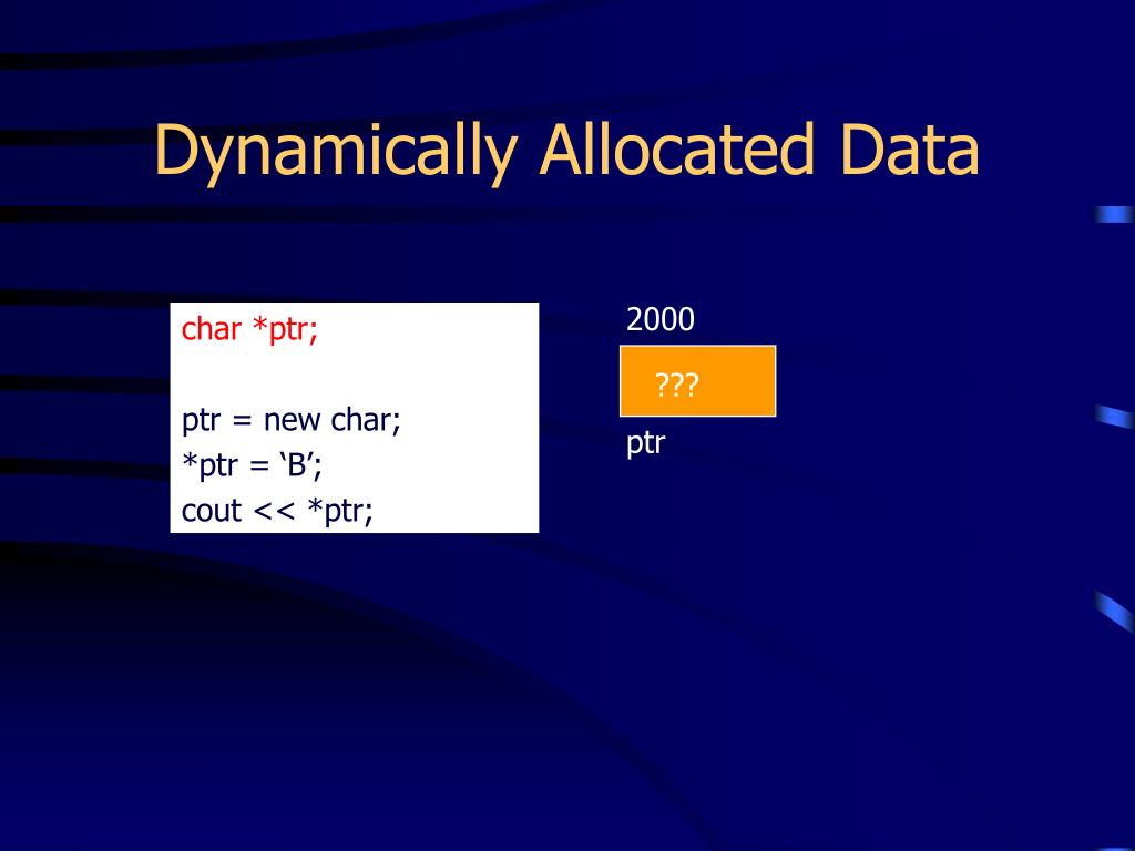 2000 ptr Dynamically Allocated Data char* ptr; ptr = new char; *ptr = ‘B’; cout << *ptr;
