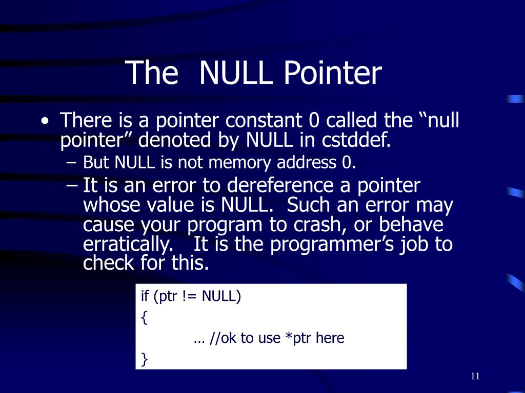 The NULL Pointer • There is a pointer constant 0 called the “null pointer” denoted by NULL in cstddef. • But NULL is not memory address 0. • It is an error to dereference a pointer whose value is NULL. Such an error may cause your program to crash, or behave erratically. It is the programmer’s job to check for this. if (ptr != NULL) { … //ok to use *ptr here }