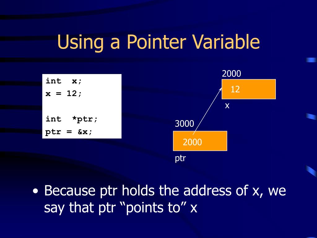 Using a Pointer Variable 2000 int x; x = 12; int *ptr; ptr = &x; 12 x 3000 2000 ptr • Because ptr holds the address of x, we say that ptr “points to” x