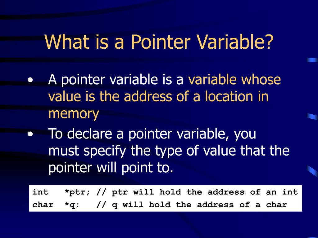 What is a Pointer Variable? • A pointer variable is a variable whose value is the address of a location in memory • To declare a pointer variable, you must specify the type of value that the pointer will point to. int *ptr; // ptr will hold the address of an int char *q; // q will hold the address of a char