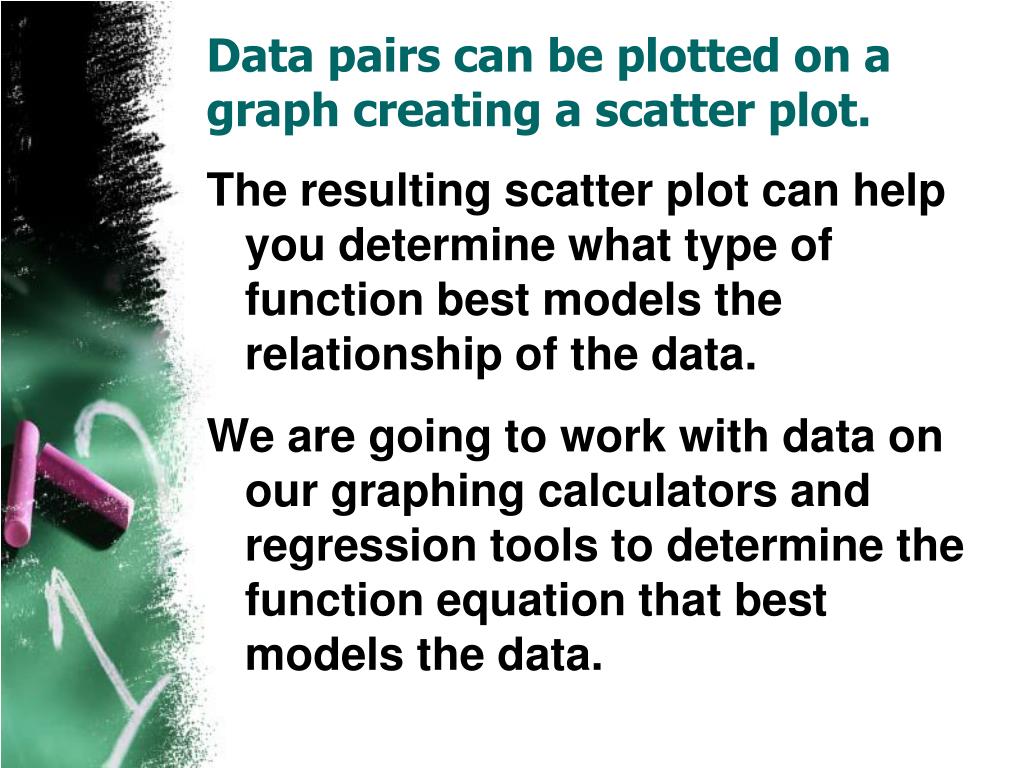 Data pairs can be plotted on a graph creating a scatter plot. The resulting scatter plot can help you determine what type of function best models the relationship of the data. We are going to work with data on our graphing calculators and regression tools to determine the function equation that best models the data.
