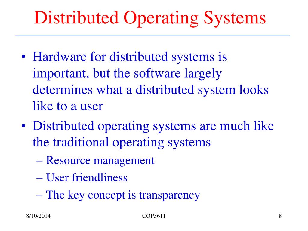 Distributed Operating Systems • Hardware for distributed systems is important, but the software largely determines what a distributed system looks like to a user • Distributed operating systems are much like the traditional operating systems • Resource management • User friendliness • The key concept is transparency COP5611