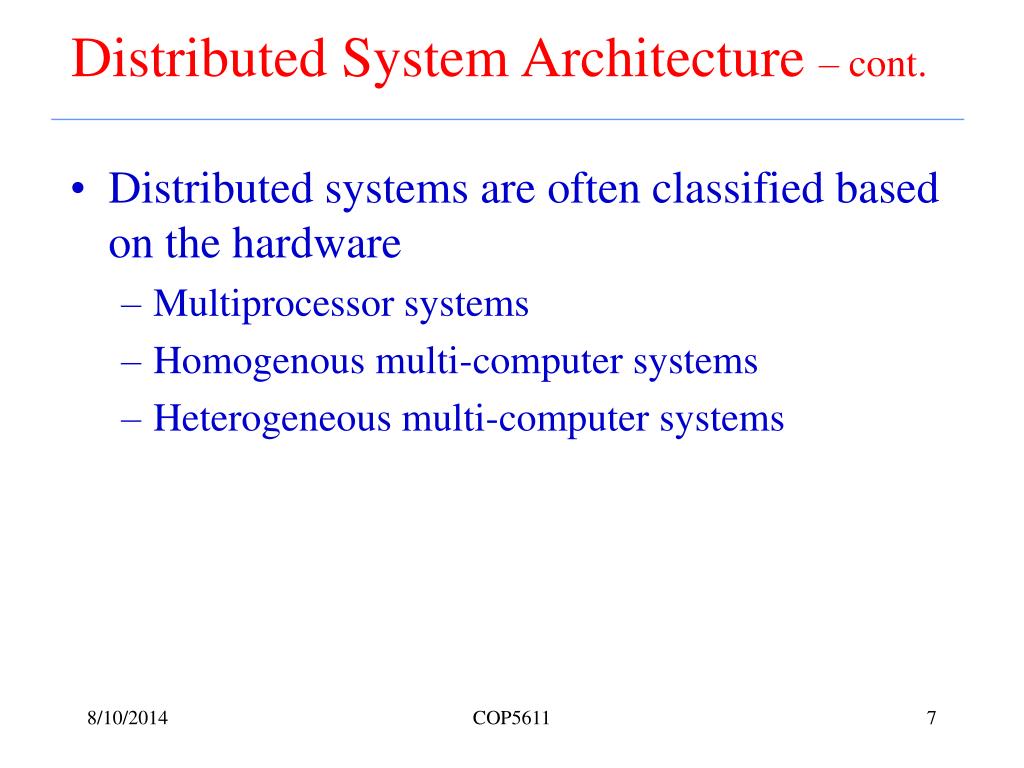 Distributed System Architecture – cont. • Distributed systems are often classified based on the hardware • Multiprocessor systems • Homogenous multi-computer systems • Heterogeneous multi-computer systems COP5611