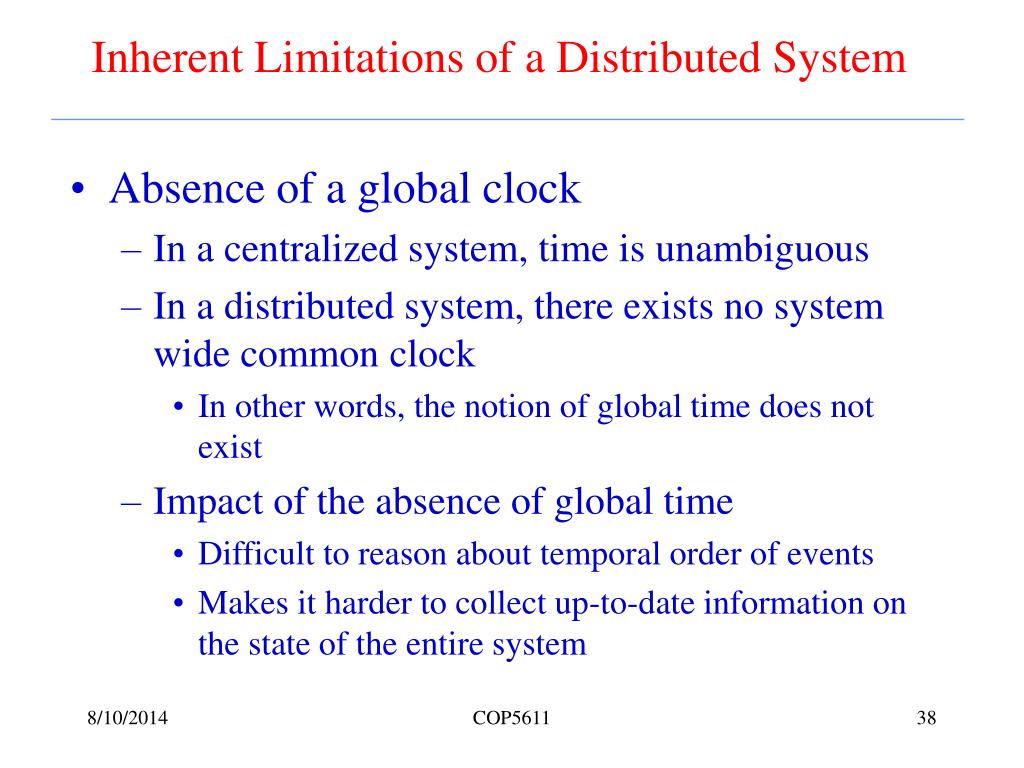 Inherent Limitations of a Distributed System • Absence of a global clock • In a centralized system, time is unambiguous • In a distributed system, there exists no system wide common clock • In other words, the notion of global time does not exist • Impact of the absence of global time • Difficult to reason about temporal order of events • Makes it harder to collect up-to-date information on the state of the entire system COP5611