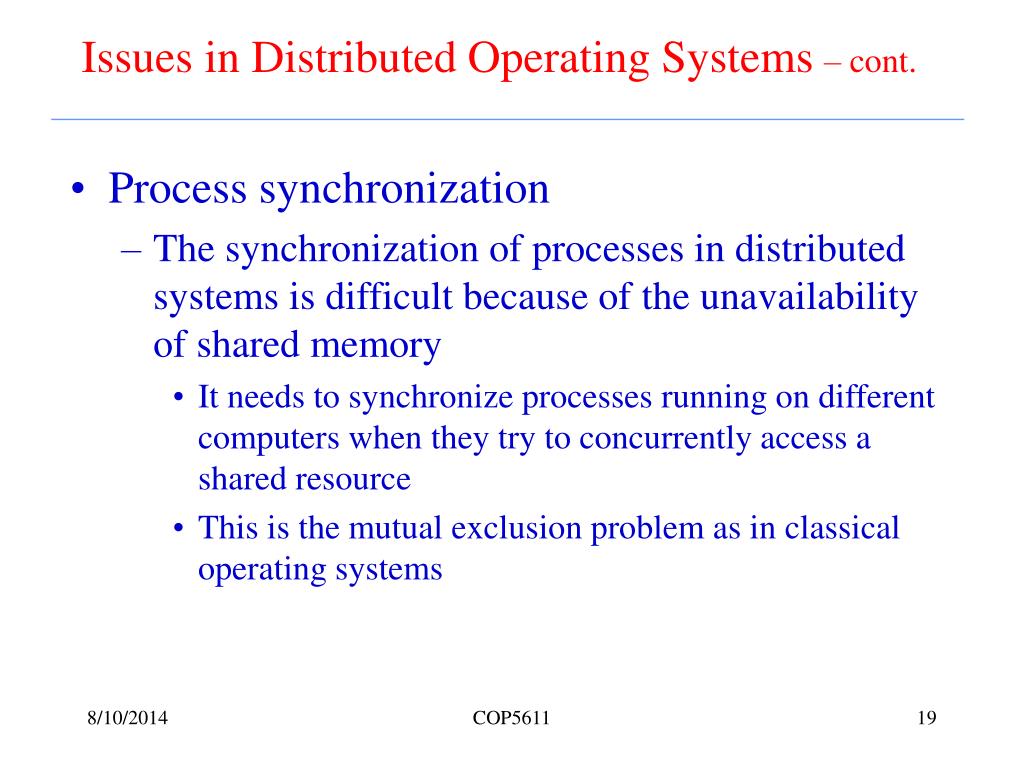 Issues in Distributed Operating Systems – cont. • Process synchronization • The synchronization of processes in distributed systems is difficult because of the unavailability of shared memory • It needs to synchronize processes running on different computers when they try to concurrently access a shared resource • This is the mutual exclusion problem as in classical operating systems COP5611
