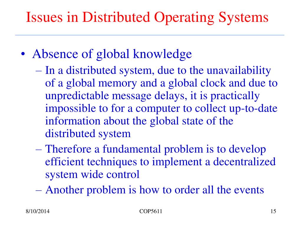 Issues in Distributed Operating Systems • Absence of global knowledge • In a distributed system, due to the unavailability of a global memory and a global clock and due to unpredictable message delays, it is practically impossible to for a computer to collect up-to-date information about the global state of the distributed system • Therefore a fundamental problem is to develop efficient techniques to implement a decentralized system wide control • Another problem is how to order all the events COP5611