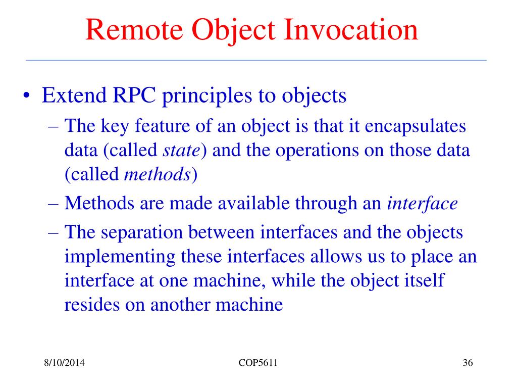 Remote Object Invocation • Extend RPC principles to objects • The key feature of an object is that it encapsulates data (called state) and the operations on those data (called methods) • Methods are made available through an interface • The separation between interfaces and the objects implementing these interfaces allows us to place an interface at one machine, while the object itself resides on another machine COP5611