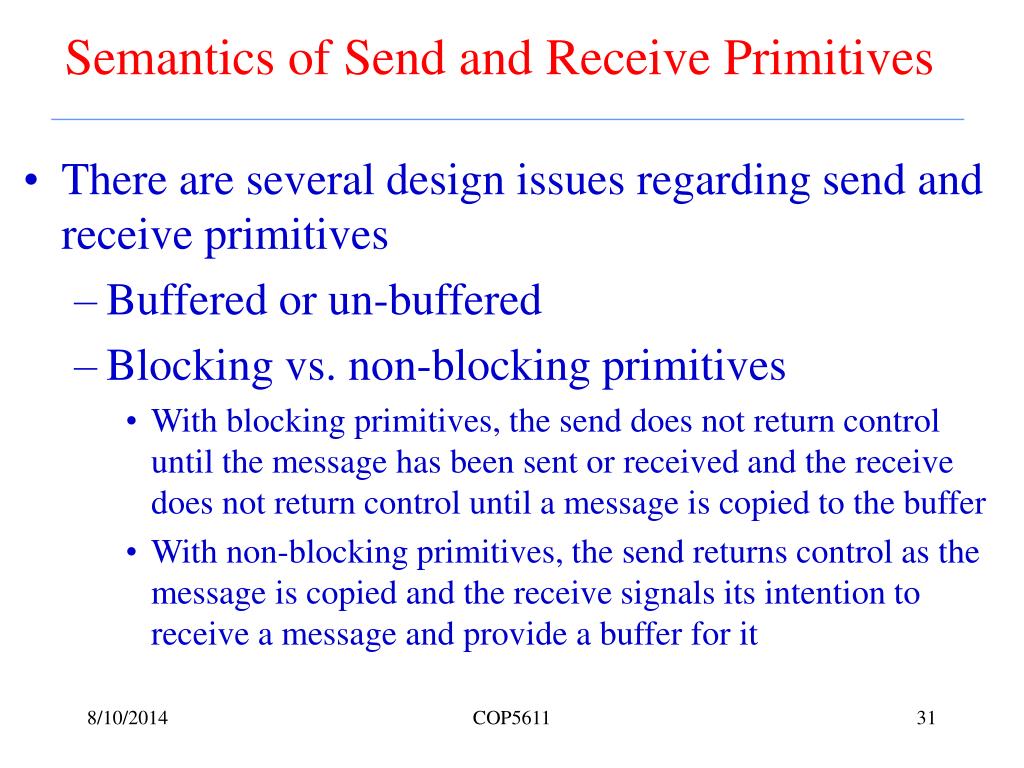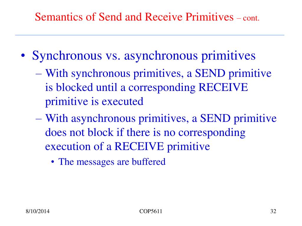 Semantics of Send and Receive Primitives – cont. • Synchronous vs. asynchronous primitives • With synchronous primitives, a SEND primitive is blocked until a corresponding RECEIVE primitive is executed • With asynchronous primitives, a SEND primitive does not block if there is no corresponding execution of a RECEIVE primitive • The messages are buffered COP5611