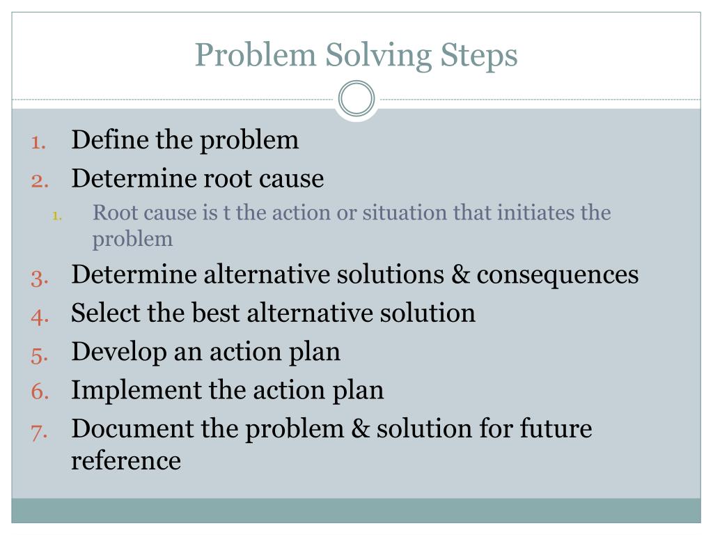 Problem Solving Steps • Define the problem • Determine root cause • Root cause is t the action or situation that initiates the problem • Determine alternative solutions & consequences • Select the best alternative solution • Develop an action plan • Implement the action plan • Document the problem & solution for future reference
