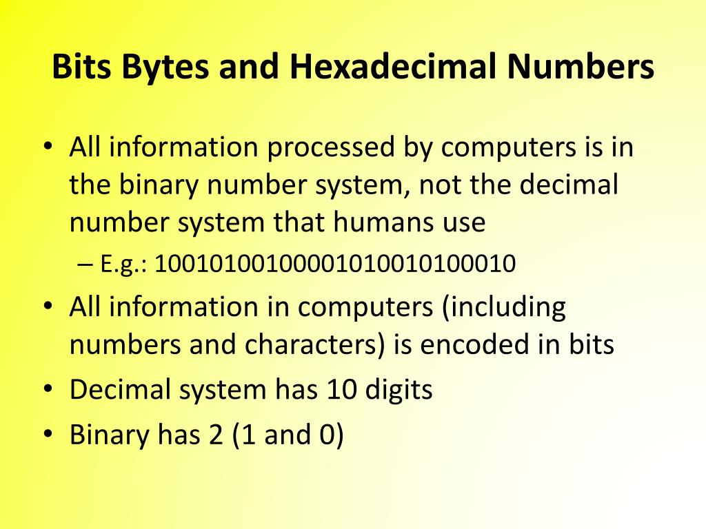 Bits Bytes and Hexadecimal Numbers • All information processed by computers is in the binary number system, not the decimal number system that humans use • E.g.: 10010100100001010010100010 • All information in computers (including numbers and characters) is encoded in bits • Decimal system has 10 digits • Binary has 2 (1 and 0)