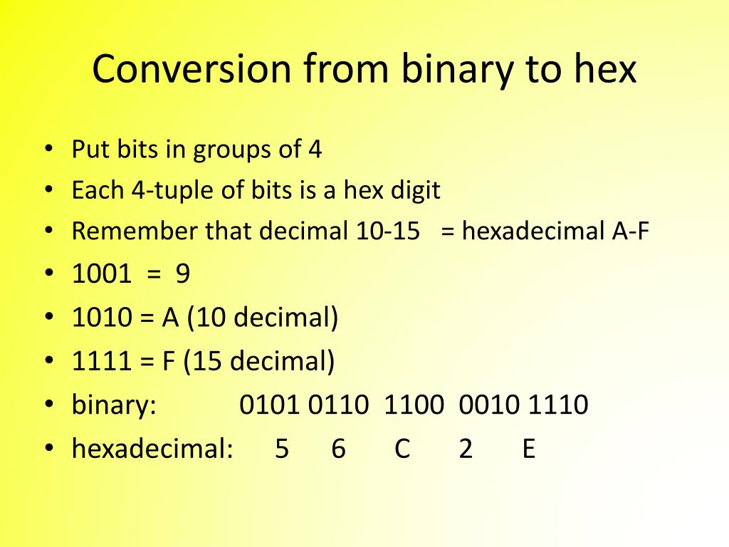 Conversion from binary to hex • Put bits in groups of 4 • Each 4-tuple of bits is a hex digit • Remember that decimal 10-15 = hexadecimal A-F • 1001 = 9 • 1010 = A (10 decimal) • 1111 = F (15 decimal) • binary: 0101 0110 1100 0010 1110 • hexadecimal: 5 6 C 2 E