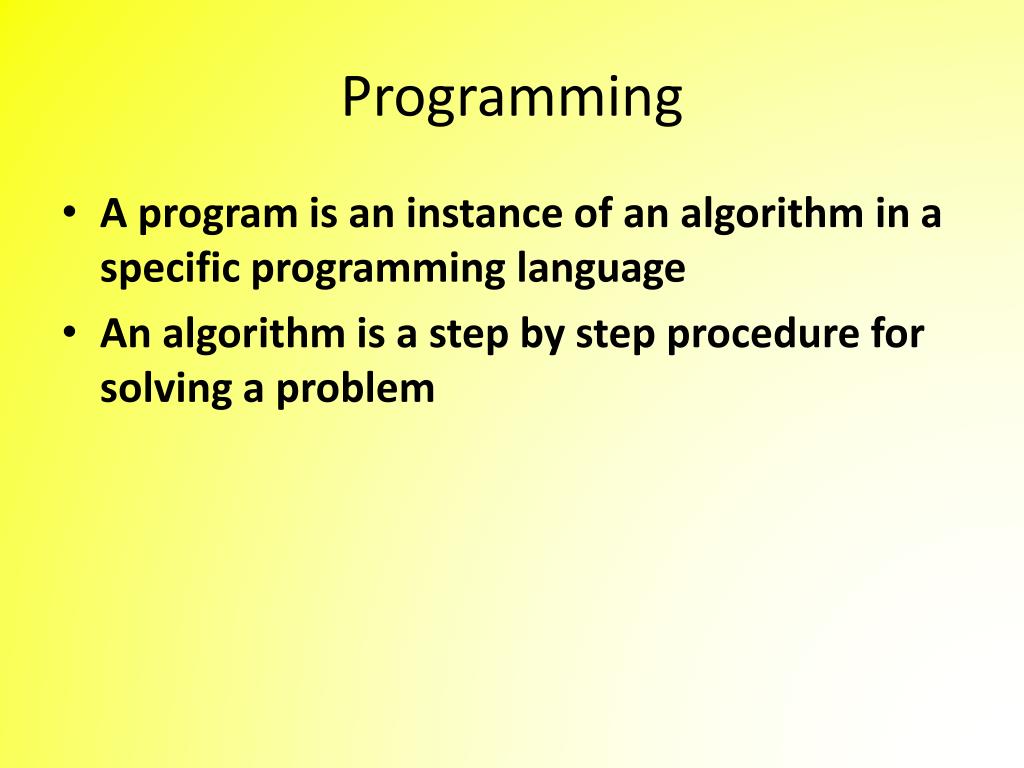 Programming • A program is an instance of an algorithm in a specific programming language • An algorithm is a step by step procedure for solving a problem