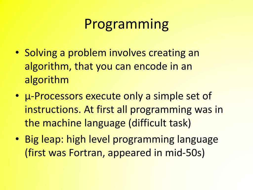 Programming • Solving a problem involves creating an algorithm, that you can encode in an algorithm • µ-Processors execute only a simple set of instructions. At first all programming was in the machine language (difficult task) • Big leap: high level programming language (first was Fortran, appeared in mid-50s)