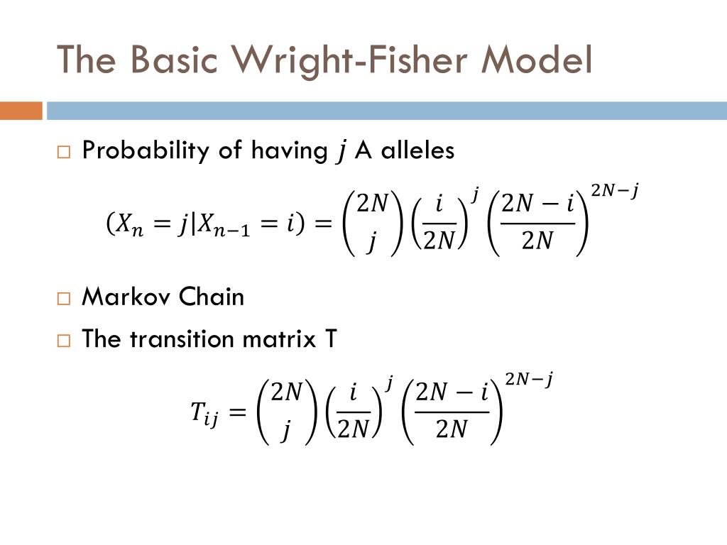 The Basic Wright-Fisher Model • Probability of having A alleles • Markov Chain • The transition matrix T