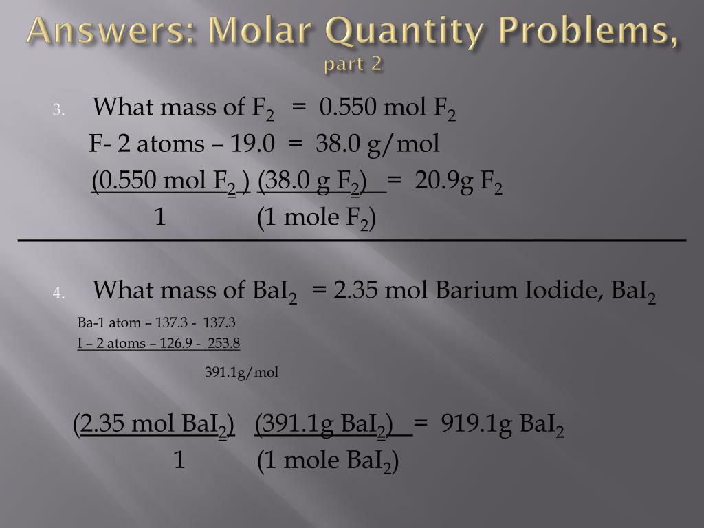 Answers: Molar Quantity Problems, part 2 • What mass of F2 = 0.550 mol F2 F- 2 atoms – 19.0 = 38.0 g/mol (0.550 mol F2 )(38.0 g F2) = 20.9g F2 1 (1 mole F2) • What mass of BaI2 = 2.35 mol Barium Iodide, BaI2 Ba-1 atom – 137.3 - 137.3 I – 2 atoms – 126.9 - 253.8 391.1g/mol (2.35 mol BaI2)(391.1g BaI2) = 919.1g BaI2 1 (1 mole BaI2)
