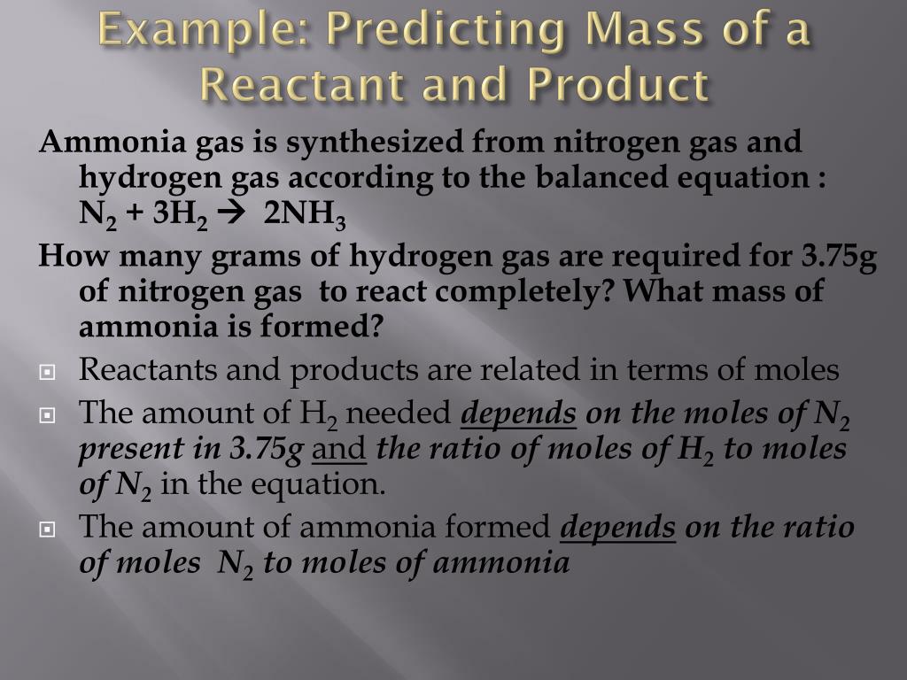 Example: Predicting Mass of a Reactant and Product Ammonia gas is synthesized from nitrogen gas and hydrogen gas according to the balanced equation : N2 + 3H2 2NH3 How many grams of hydrogen gas are required for 3.75g of nitrogen gas to react completely? What mass of ammonia is formed? • Reactants and products are related in terms of moles • The amount of H2 needed depends on the moles of N2 present in 3.75g andthe ratio of moles of H2 to moles of N2 in the equation. • The amount of ammonia formed depends on the ratio of moles N2 to moles of ammonia