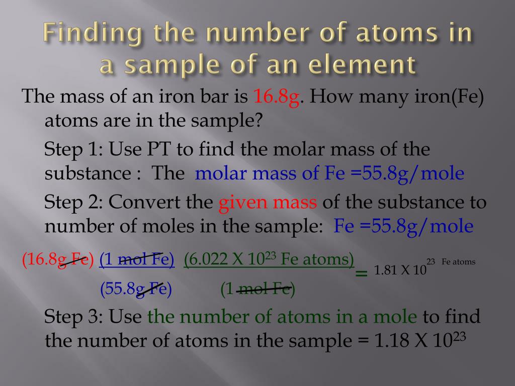 Finding the number of atoms in a sample of an element The mass of an iron bar is 16.8g.How many iron(Fe) atoms are in the sample? Step 1: Use PT to find the molar mass of the substance : The molar mass of Fe =55.8g/mole Step 2: Convert the given mass of the substance to number of moles in the sample: Fe =55.8g/mole (16.8g Fe) (1 mol Fe)(6.022 X 1023 Fe atoms)=1.81 X 1023 Fe atoms (55.8g Fe) (1 mol Fe) Step 3: Use the number of atoms in a mole to find the number of atoms in the sample = 1.18 X 1023