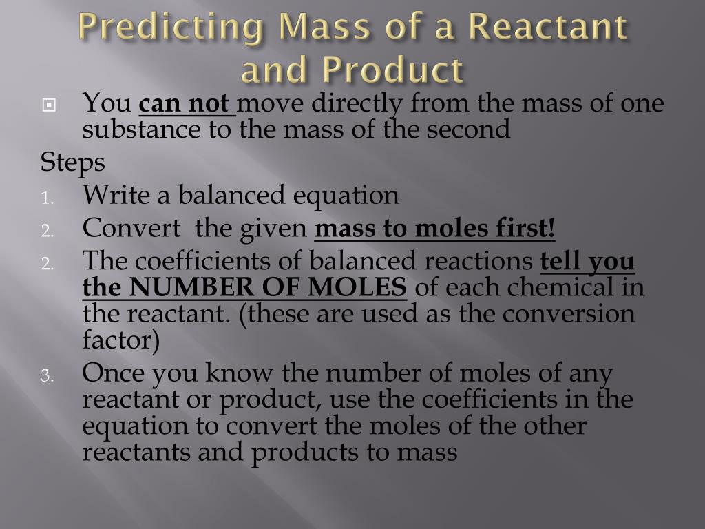Predicting Mass of a Reactant and Product • You can not move directly from the mass of one substance to the mass of the second Steps • Write a balanced equation • Convert the given mass to moles first! • The coefficients of balanced reactions tell you the NUMBER OF MOLESof each chemical in the reactant. (these are used as the conversion factor) • Once you know the number of moles of any reactant or product, use the coefficients in the equation to convert the moles of the other reactants and products to mass