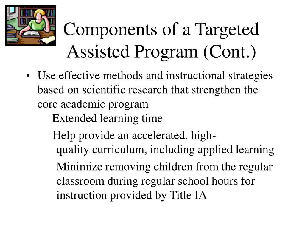Components of a Targeted Assisted Program (Cont.) • Use effective methods and instructional strategies based on scientific research that strengthen the core academic program Extended learning time Help provide an accelerated, high- quality curriculum, including applied learning Minimize removing children from the regular classroom during regular school hours for instruction provided by Title IA