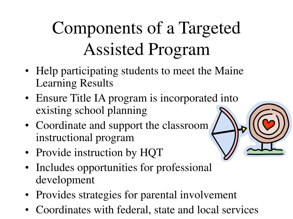 Components of a Targeted Assisted Program • Help participating students to meet the Maine Learning Results • Ensure Title IA program is incorporated into existing school planning • Coordinate and support the classroom instructional program • Provide instruction by HQT • Includes opportunities for professional development • Provides strategies for parental involvement • Coordinates with federal, state and local services