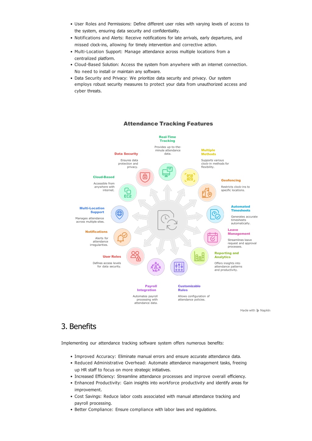 UserRolesandPermissions:Definedifferentuserroleswithvaryinglevelsofaccessto thesystem,ensuringdatasecurityandconfidentiality. • NotificationsandAlerts:Receivenotificationsforlatearrivals,earlydepartures,and missedclock-ins,allowingfortimelyinterventionandcorrectiveaction. • Multi-LocationSupport:Manageattendanceacrossmultiplelocationsfroma • centralizedplatform. • Cloud-BasedSolution:Accessthesystemfromanywherewithaninternetconnection. Noneedtoinstallormaintainanysoftware. • DataSecurityandPrivacy:Weprioritizedatasecurityandprivacy.Oursystem • employsrobustsecuritymeasurestoprotectyourdatafromunauthorizedaccessand cyberthreats. AttendanceTrackingFeatures Real-Time Tracking Providesup-to-the- minuteattendance data. Multiple Methods Supportsvarious clock-in methods for flexibility. DataSecurity Ensuresdata protectionand privacy. Cloud-Based Accessible from anywherewith internet. Geofencing Restrictsclock-insto specificlocations. Automated Timesheets Generatesaccurate timesheets automatically. Leave Management Streamlinesleave requestandapproval processes. Reportingand Analytics Offersinsightsinto attendancepatterns andproductivity. Multi-Location Support Managesattendance acrossmultiplesites. Notifications Alertsfor attendance irregularities. UserRoles Defines accesslevels fordatasecurity. Payroll Integration Automatespayroll processingwith attendancedata. Customizable Rules Allowsconfigurationof attendancepolicies. 3.Benefits • Implementingourattendancetrackingsoftwaresystemoffersnumerousbenefits: • ImprovedAccuracy:Eliminatemanualerrorsandensureaccurateattendancedata. • ReducedAdministrativeOverhead:Automateattendancemanagementtasks,freeing upHRstafftofocusonmorestrategicinitiatives. • IncreasedEfficiency:Streamlineattendanceprocessesandimproveoverallefficiency. • EnhancedProductivity:Gaininsightsintoworkforceproductivityandidentifyareasfor improvement. • CostSavings:Reducelaborcostsassociatedwithmanualattendancetrackingand • payrollprocessing. • BetterCompliance:Ensurecompliancewithlaborlaws andregulations.