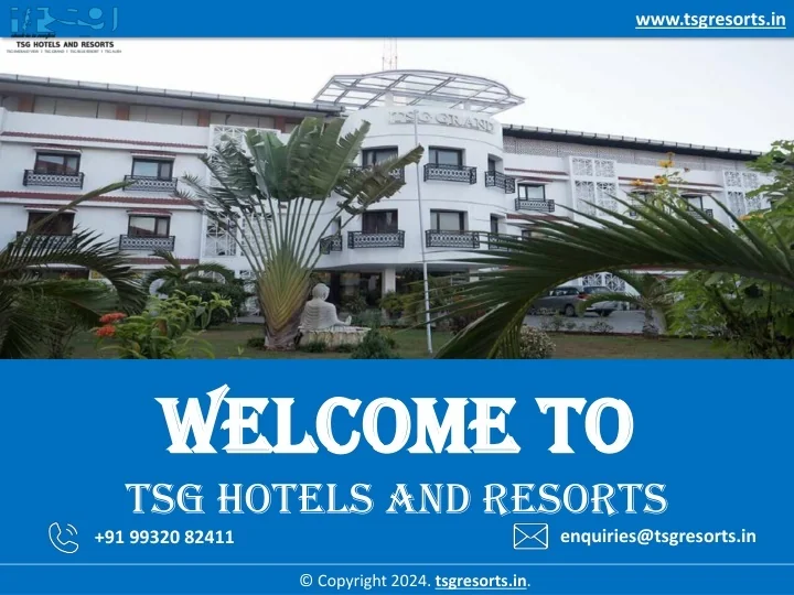 www.tsgresorts.in Our Hotels & Resorts Welcome To Welcome To TSG Hotels and Resorts +91 99320 82411 enquiries@tsgresorts.in © Copyright 2024. tsgresorts.in.