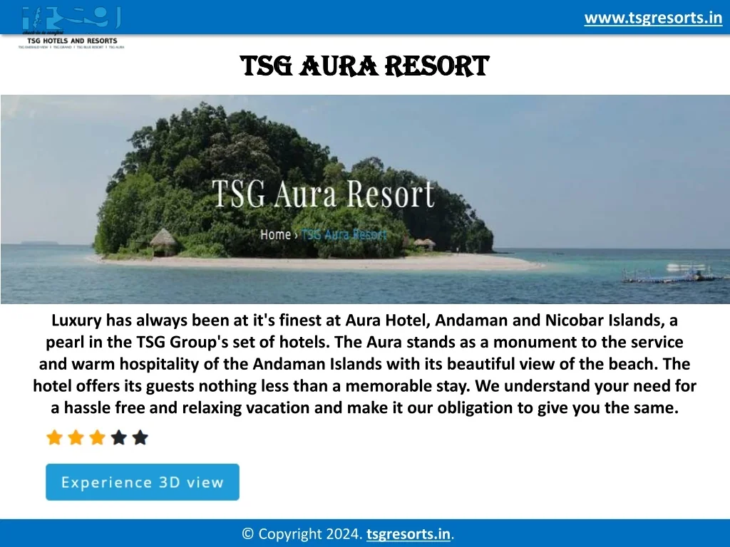 www.tsgresorts.in TSG Aura Resort TSG Aura Resort Luxury has always been at it's finest at Aura Hotel, Andaman and Nicobar Islands, a pearl in the TSG Group's set of hotels. The Aura stands as a monument to the service and warm hospitality of the Andaman Islands with its beautiful view of the beach. The hotel offers its guests nothing less than a memorable stay. We understand your need for a hassle free and relaxing vacation and make it our obligation to give you the same. © Copyright 2024. tsgresorts.in.