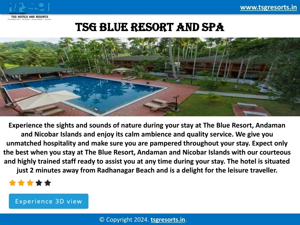www.tsgresorts.in TSG Blue Resort and Spa TSG Blue Resort and Spa Experience the sights and sounds of nature during your stay at The Blue Resort, Andaman and Nicobar Islands and enjoy its calm ambience and quality service. We give you unmatched hospitality and make sure you are pampered throughout your stay. Expect only the best when you stay at The Blue Resort, Andaman and Nicobar Islands with our courteous and highly trained staff ready to assist you at any time during your stay. The hotel is situated just 2 minutes away from Radhanagar Beach and is a delight for the leisure traveller. © Copyright 2024. tsgresorts.in.
