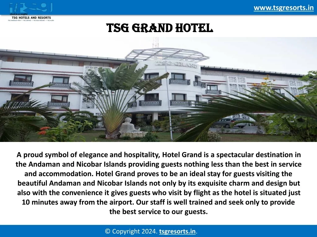 www.tsgresorts.in TSG Grand Hotel TSG Grand Hotel A proud symbol of elegance and hospitality, Hotel Grand is a spectacular destination in the Andaman and Nicobar Islands providing guests nothing less than the best in service and accommodation. Hotel Grand proves to be an ideal stay for guests visiting the beautiful Andaman and Nicobar Islands not only by its exquisite charm and design but also with the convenience it gives guests who visit by flight as the hotel is situated just 10 minutes away from the airport. Our staff is well trained and seek only to provide the best service to our guests. © Copyright 2024. tsgresorts.in.