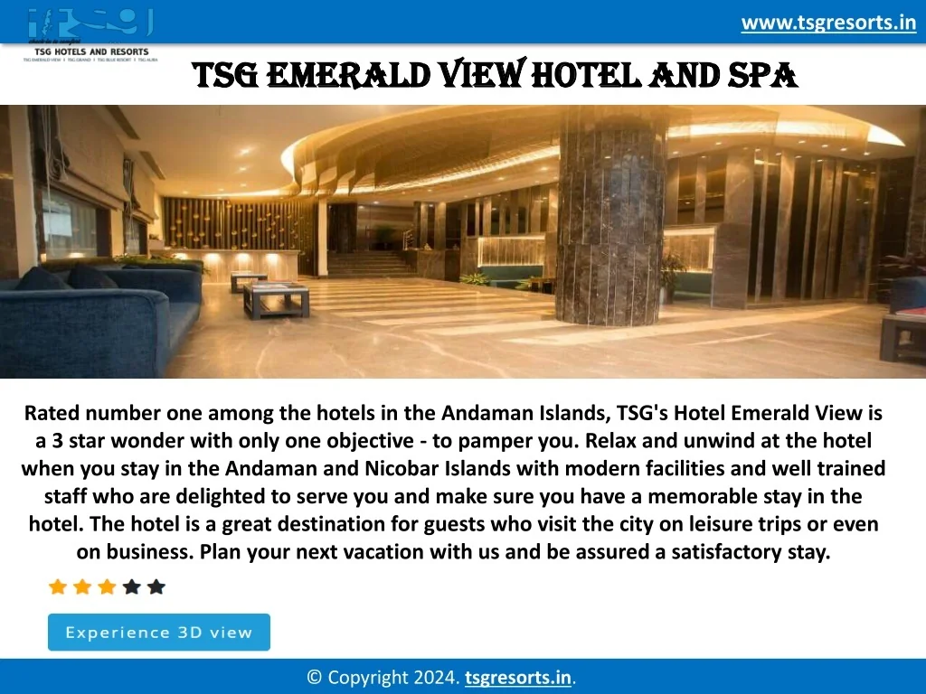 www.tsgresorts.in TSG Emerald View Hotel and Spa TSG Emerald View Hotel and Spa Rated number one among the hotels in the Andaman Islands, TSG's Hotel Emerald View is a 3 star wonder with only one objective - to pamper you. Relax and unwind at the hotel when you stay in the Andaman and Nicobar Islands with modern facilities and well trained staff who are delighted to serve you and make sure you have a memorable stay in the hotel. The hotel is a great destination for guests who visit the city on leisure trips or even on business. Plan your next vacation with us and be assured a satisfactory stay. © Copyright 2024. tsgresorts.in.