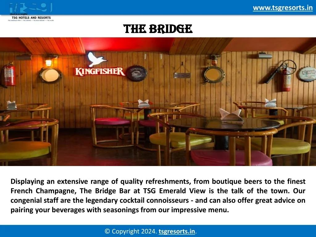 www.tsgresorts.in The Bridge The Bridge Displaying an extensive range of quality refreshments, from boutique beers to the finest French Champagne, The Bridge Bar at TSG Emerald View is the talk of the town. Our congenial staff are the legendary cocktail connoisseurs - and can also offer great advice on pairing your beverages with seasonings from our impressive menu. © Copyright 2024. tsgresorts.in.