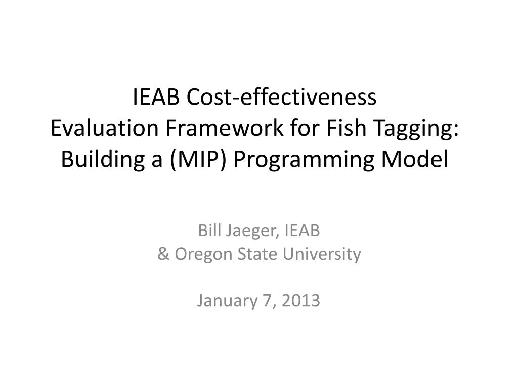 IEAB Cost-effectiveness Evaluation Framework for Fish Tagging: Building a (MIP) Programming Model. Bill Jaeger, IEAB & Oregon State University January 7, 2013. Outline of Presentation. Describe programming approach Demo of simple model examples More on specifics of approach