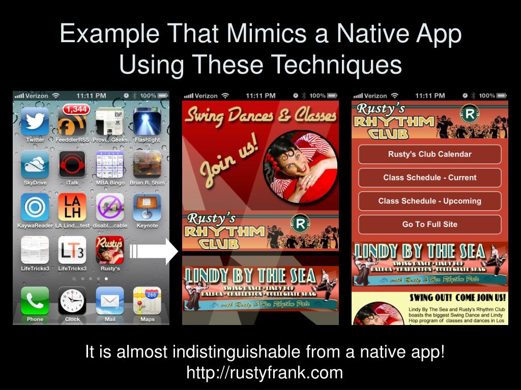 Example That Mimics a Native App Using These Techniques It is almost indistinguishable from a native app!http://rustyfrank.com