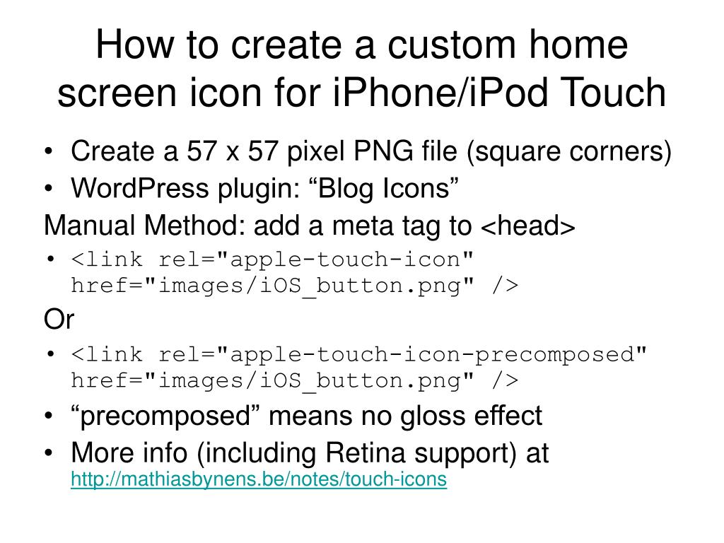 How to create a custom home screen icon for iPhone/iPod Touch • Create a 57 x 57 pixel PNG file (square corners) • WordPress plugin: “Blog Icons” Manual Method: add a meta tag to <head> • <link rel="apple-touch-icon" href="images/iOS_button.png" /> Or • <link rel="apple-touch-icon-precomposed" href="images/iOS_button.png" /> • “precomposed” means no gloss effect • More info (including Retina support) at http://mathiasbynens.be/notes/touch-icons