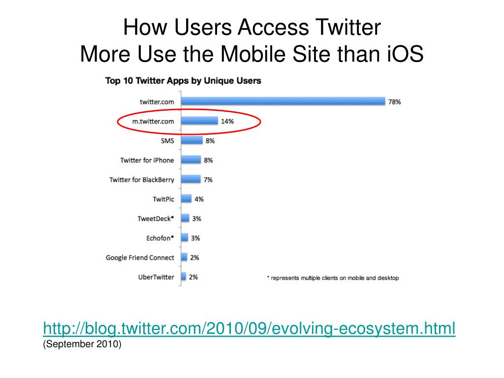 How Users Access TwitterMore Use the Mobile Site than iOS http://blog.twitter.com/2010/09/evolving-ecosystem.html(September 2010)