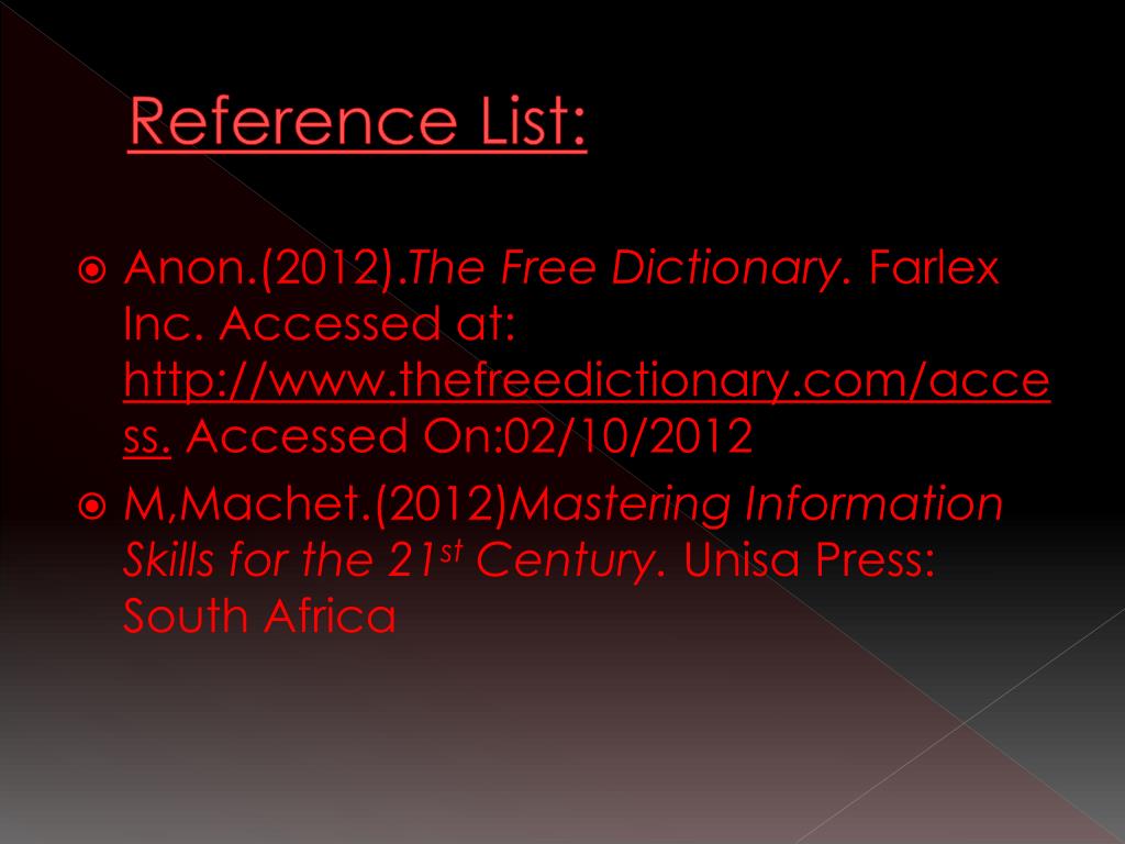 Reference List: • Anon.(2012).The Free Dictionary. Farlex Inc. Accessed at: http://www.thefreedictionary.com/access. Accessed On:02/10/2012 • M,Machet.(2012)Mastering Information Skills for the 21st Century. Unisa Press: South Africa