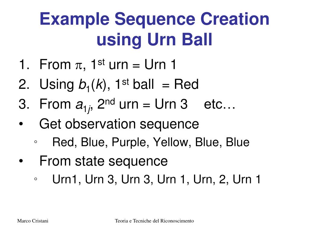 Example Sequence Creation using Urn Ball • From , 1st urn = Urn 1 • Using b1(k), 1st ball = Red • From a1j, 2nd urn = Urn 3 etc… • Get observation sequence • Red, Blue, Purple, Yellow, Blue, Blue • From state sequence • Urn1, Urn 3, Urn 3, Urn 1, Urn, 2, Urn 1 Teoria e Tecniche del Riconoscimento