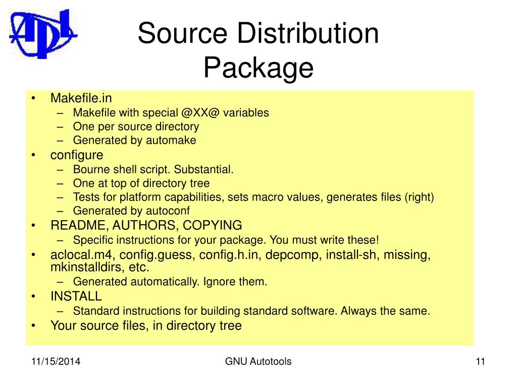 Outline • Who needs Autotools? • Open Source Software • Roles of software users • Files in a source distribution • The configure script • Autoconf, configure.ac • Automake, Makefile.am GNU Autotools