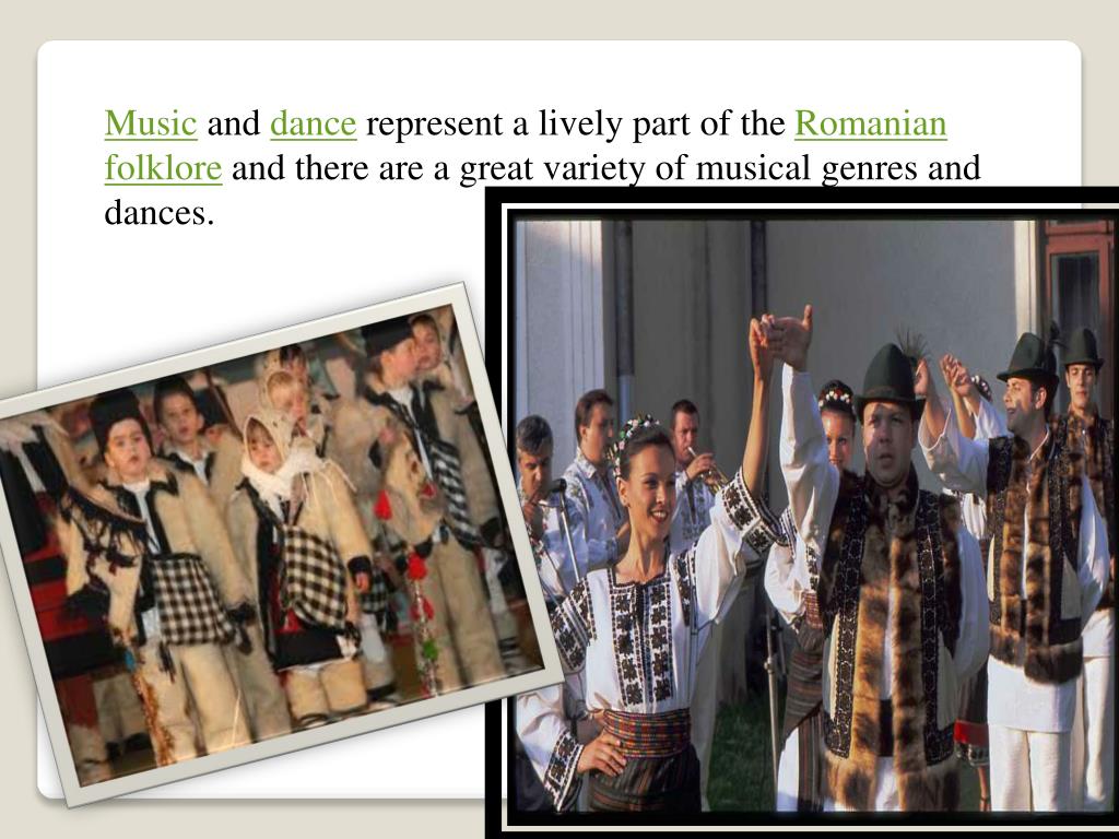 Music and dance represent a lively part of the Romanian folklore and there are a great variety of musical genres and dances.