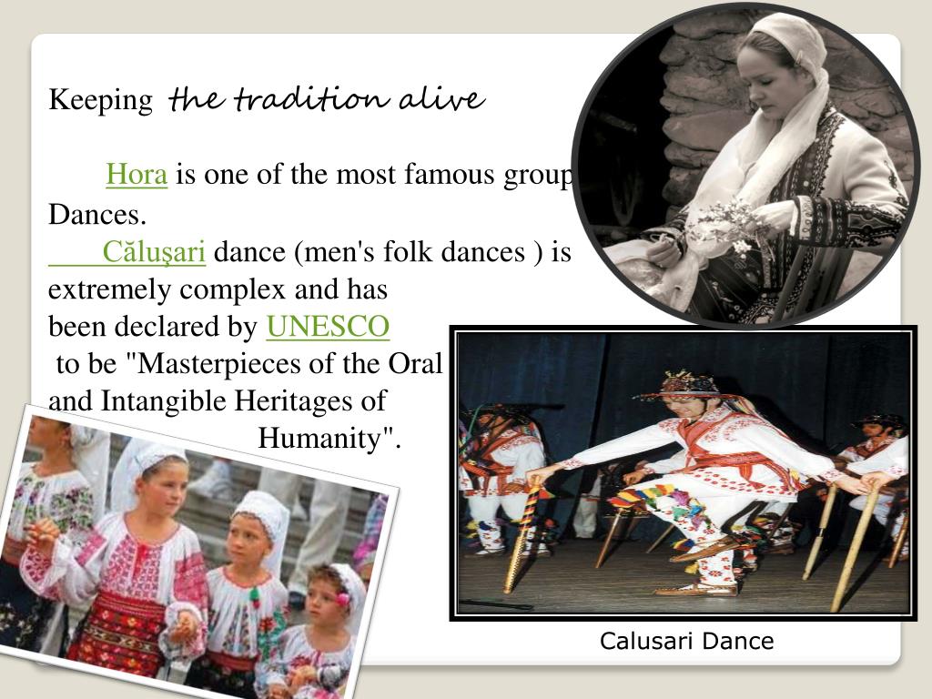 Keepingthe tradition alive Hora is one of the most famous group Dances. Căluşari dance(men's folk dances ) is extremely complex and has been declared by UNESCO to be "Masterpieces of the Oral and Intangible Heritages of Humanity". Calusari Dance