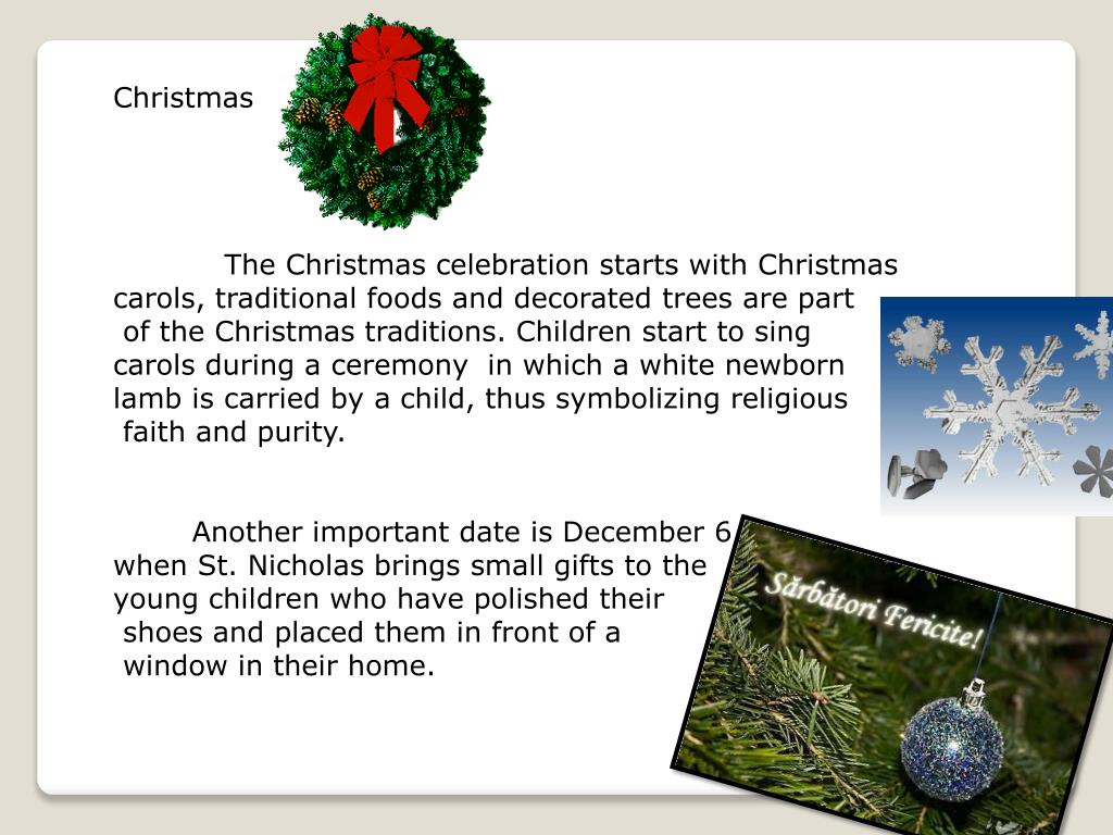 Christmas The Christmas celebration starts with Christmas carols, traditional foods and decorated trees are part of the Christmas traditions. Children start to sing carols during a ceremony in which a white newborn lamb is carried by achild, thus symbolizing religious faith and purity. Another important date is December 6, when St. Nicholas brings small gifts to the young children who have polished their shoes and placed them in front of a window in their home.